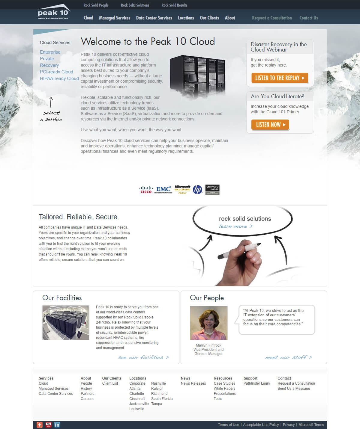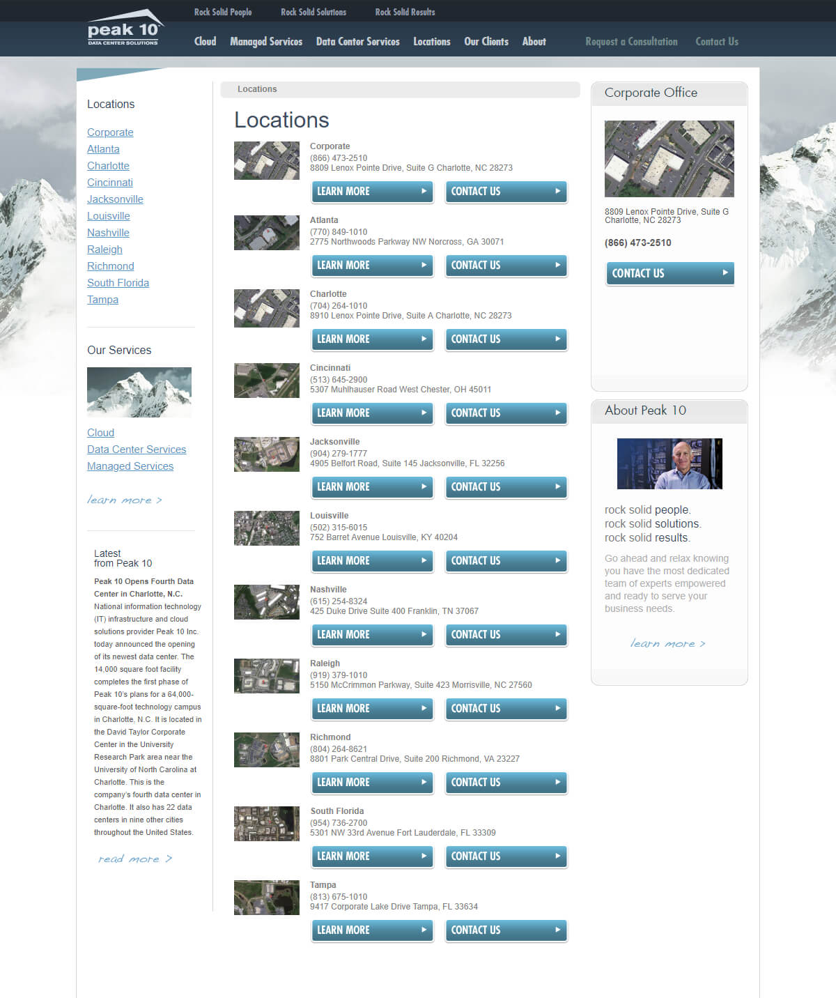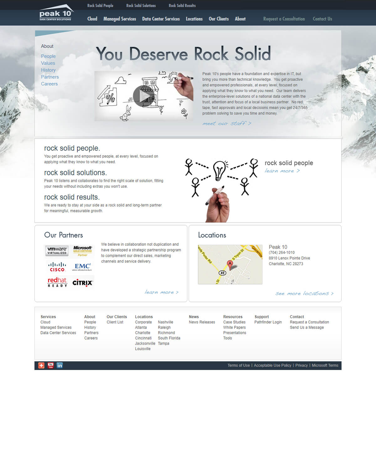 The Peak 10 project involved very intentional upfront planning to complete the 50 plus page website within the one week deadline. This rush job took the entire development team, each handling a different section. In the end it was rewarding to see this come together so smoothly over the six development days.
